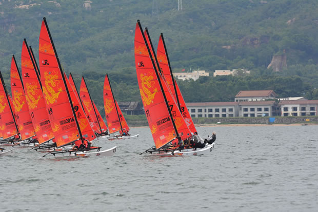 Yesterday's racing got off to a late start as overnight rain had taken some of the wind from our sails but as they they say, “That’s sailing”. Our Hobie 16 open qualifiers checked out their boats early so that the fleet could hit the water when the Race Officer had set the course and called for ‘off the beach’. The call came at around 11:30am after the sailors had prepped their cats, had an early lunch and even played some volleyball.