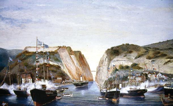 The Corinth Canal was opened in 1893, cutting short the passage of shipping between the Ionian and Aegean Seas.